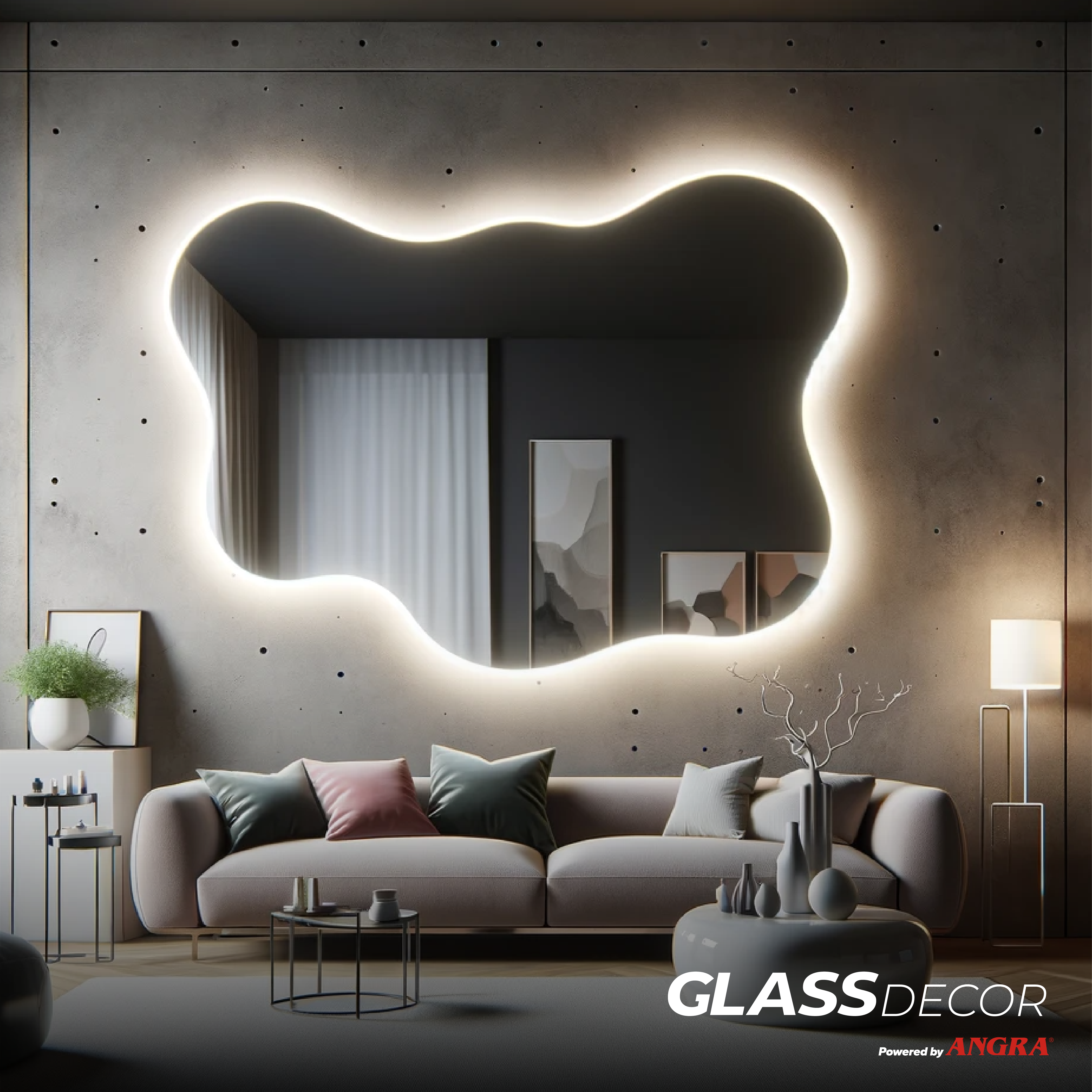 Lustro zachwyca płynną, nieregularną formą inspirowaną naturą. Jego dynamiczny kształt nadaje wnętrzu wyjątkowego charakteru, przełamując geometryczną monotonię. Podświetlenie LED wokół tafli tworzy nastrojową poświatę i podkreśla kontur lustra jak artystyczną rzeźbę na ścianie.