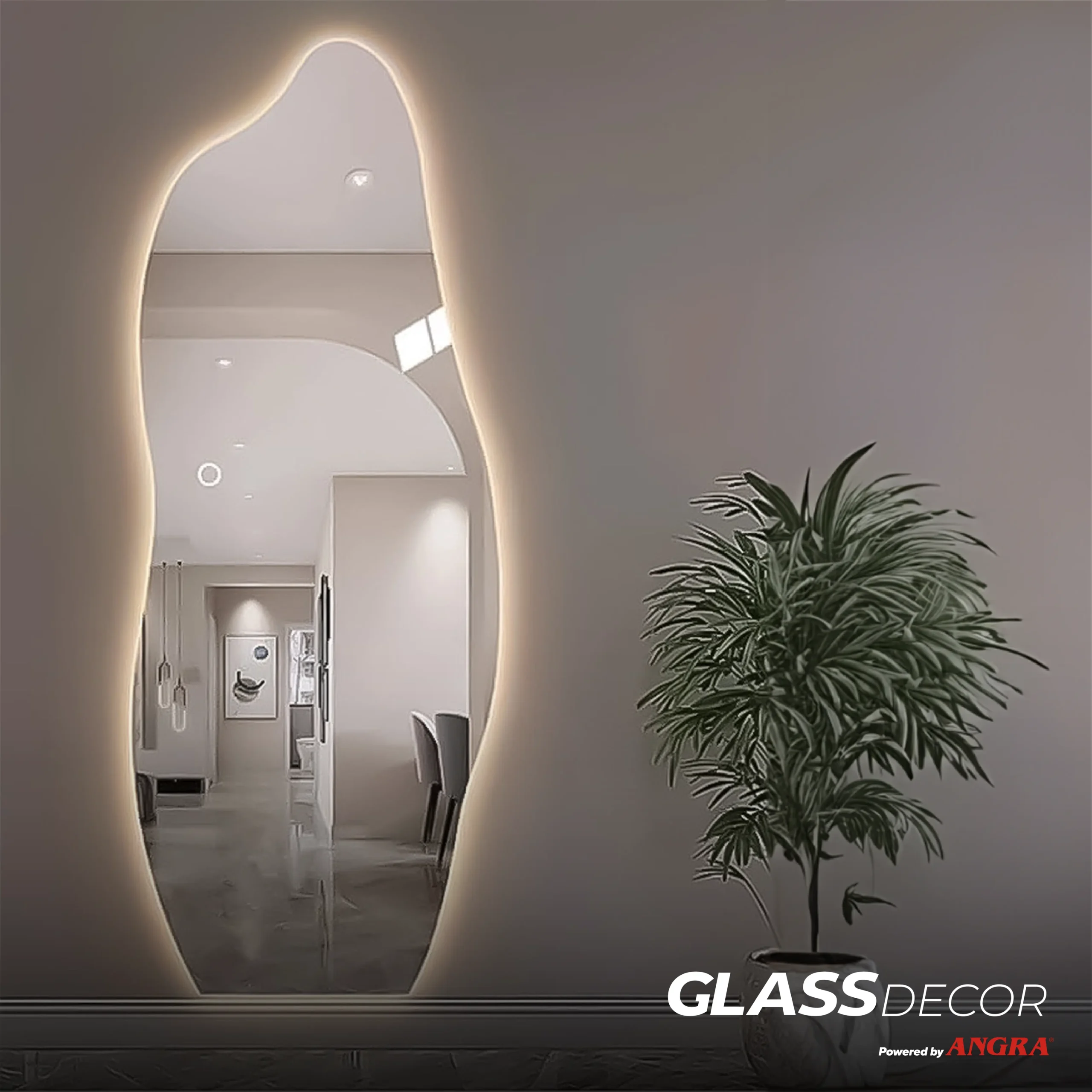 Dzięki minimalistycznej, bezramowej formie lustro doskonale wpisuje się w nowoczesne aranżacje. Zaokrąglone narożniki (lub opcjonalne ostre krawędzie) oraz subtelne światło z tyłu dodają elegancji i podkreślają fakturę ściany, na której zostało zamontowane.